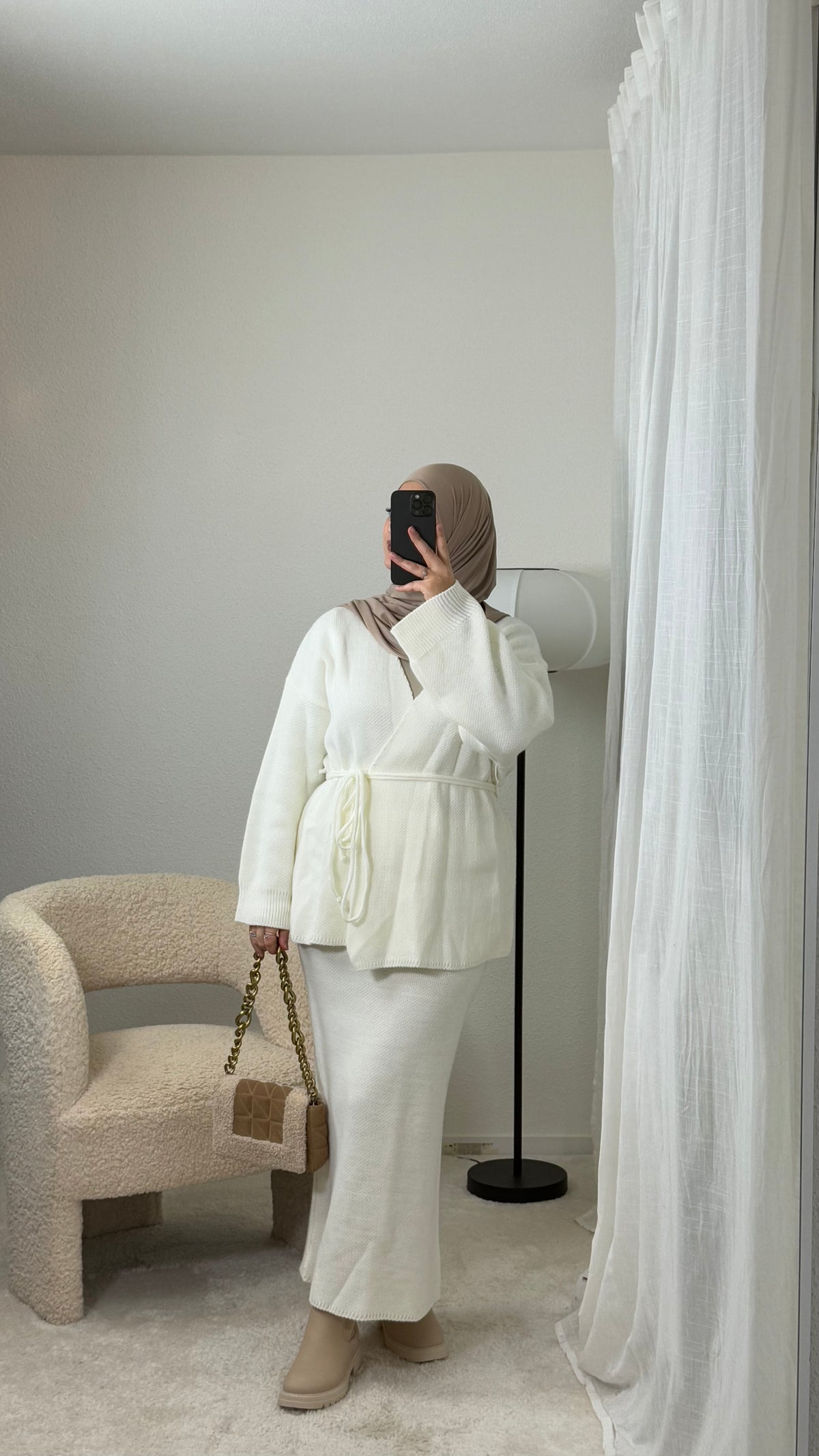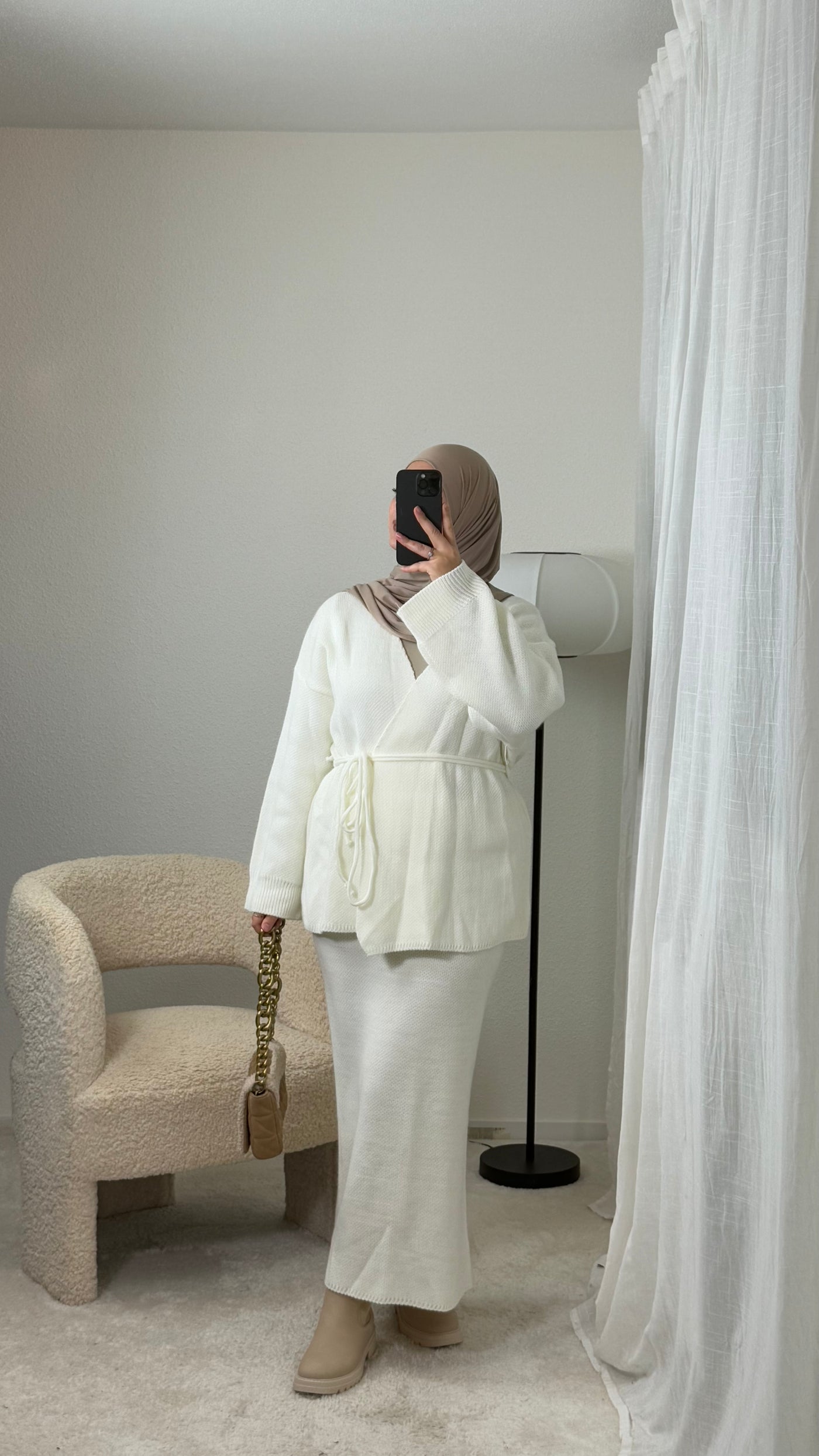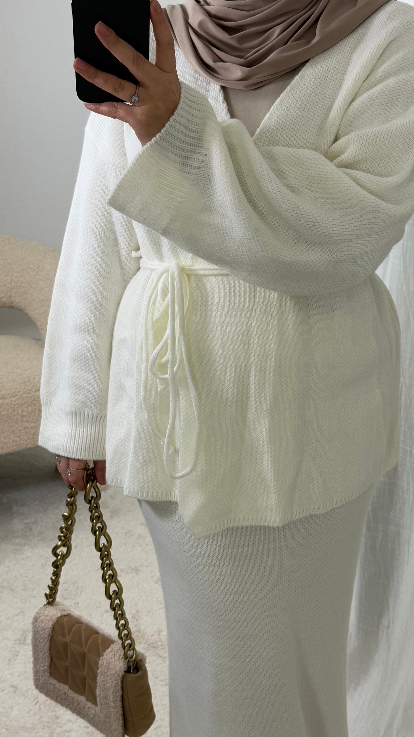 Knitted wrap cardigan set, with a long skirt. Very chic, elegant and comfortable set. Flared sleeve
