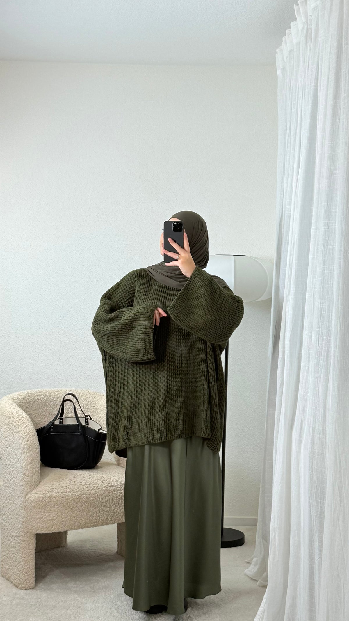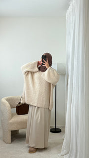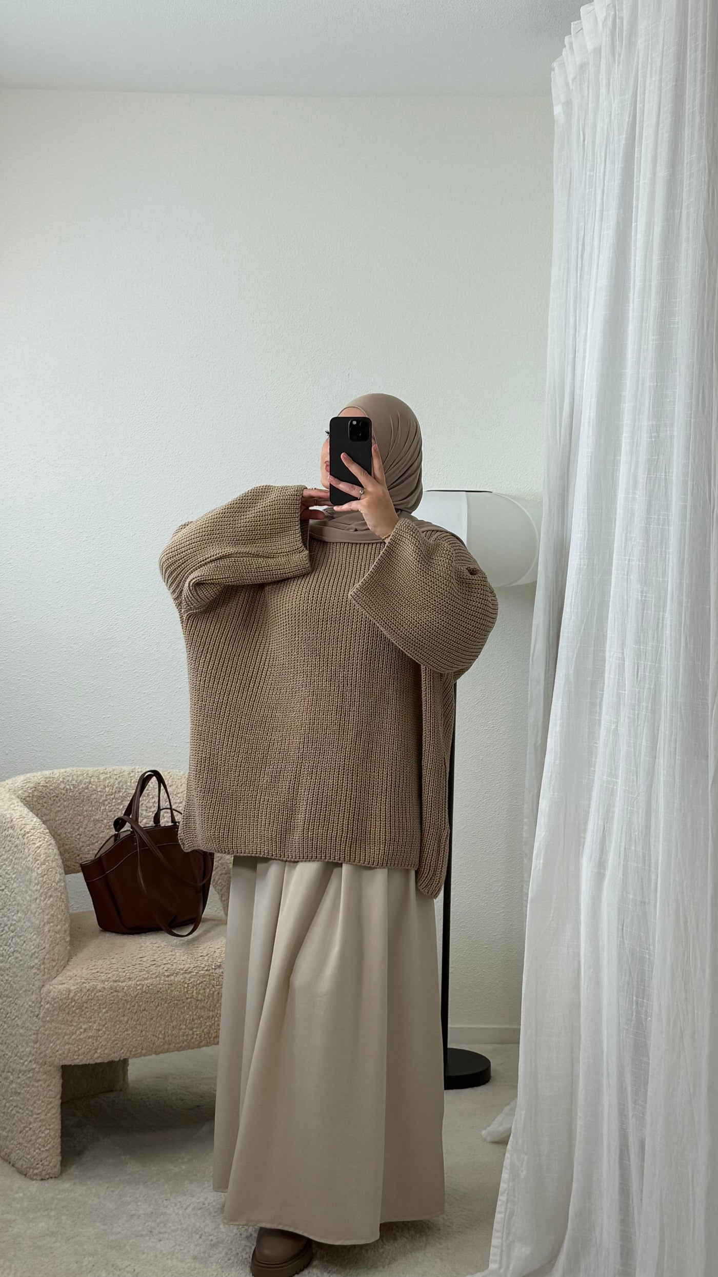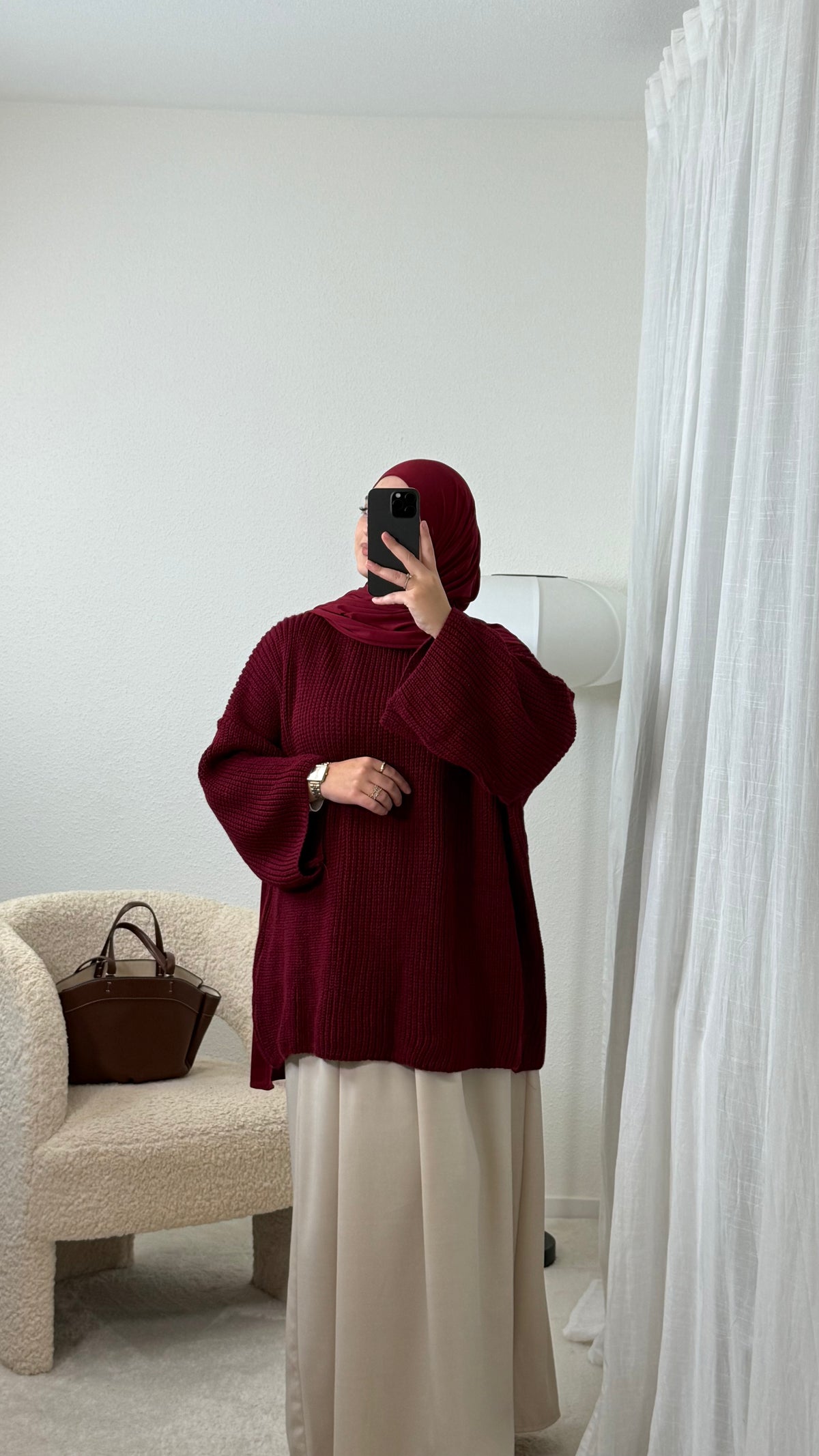 Pull en grosse maille, manche évasée, col ronds, coupe oversize.